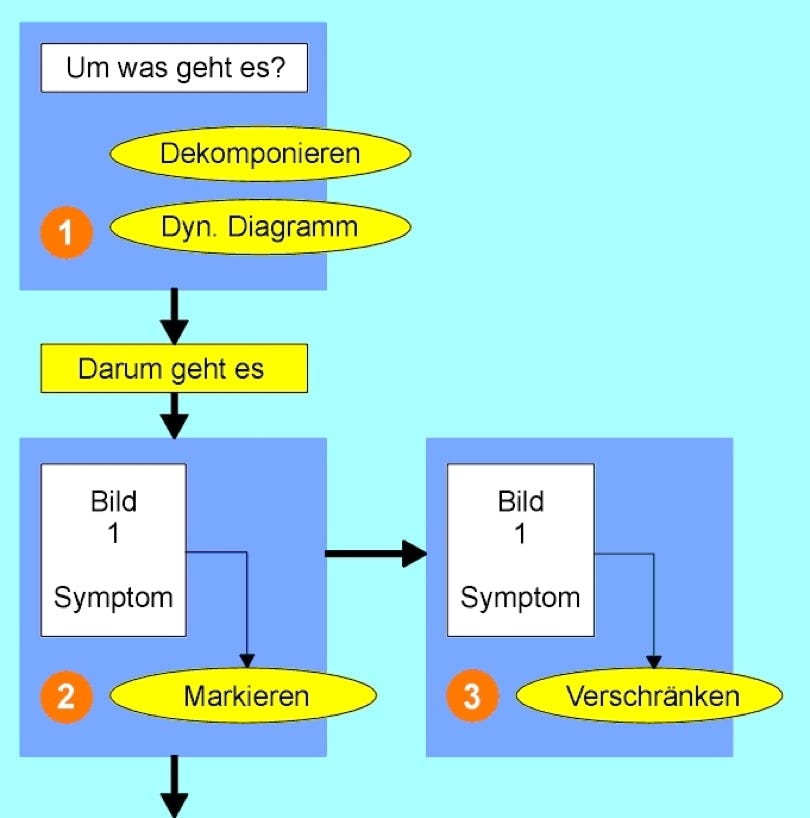 Eine auf Bild und Sprache beruhende kognitive Kunsttherapie besteht aus einer Abfolge ineinander wirken-der Sequenzen, die formallogisch aufeinander Bezug nehmen und den objektfreien Ausdrucksprozess ani-mieren und strukturieren. Die Sequenzen sollen sicherstellen, dass man sich beim Arbeiten mit objektfreien Bildern nicht in der Uferlosigkeit generalisierter, einander widersprechender Spekulationen und Fiktionen verliert, sondern dem Klienten eine ihm nützliche kognitive und emotive Orientierung vermittelt. Eine Abfol-ge solcher formallogisch aufeinander Bezug nehmender Sequenzen kann beispielsweise so aussehen: