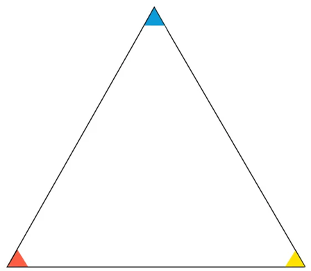 Keine dieser drei Farben sind das Resultat einer kausalen Entwicklung aufgrund einer vorhergegangenen Farbe. Das heißt, weder Gelb, Rot oder Blau können von einer einzigen ursächlichen Farbe hergeleitet und darauf reduziert werden. Daraus folgt, entweder es gibt diese drei Farben unmittelbar, kausal und zugleich (instantan), oder es gibt sie nicht. Entweder gibt es die drei Eckpunkte unmittelbar und zugleich oder es gibt kein Dreieck. Die Gestalt des Dreiecks ist entweder unabhängig von einer kausalen Entwicklung der Fall oder es gibt sie nicht, weil sie dann nicht der Fall ist. Hier gibt es weder eine Chronologie noch eine Kausa-lität. Das ist der instantane Aspekt der Gestalt, der von vornherein als Einheit und Ganzheit anwesend ist und sich in kontinuierlichen Zwischenschritten auflösen würde, sobald einer der Eckpunkte verschwindet. Analog dazu sind auch die drei Dimensionen wie die Eckpunkte eines Dreiecks instantan aufeinander be-zogen, was bedeutet, dass sie sich aufeinander beziehen und sich gegenseitig bedingen (Bild 4).