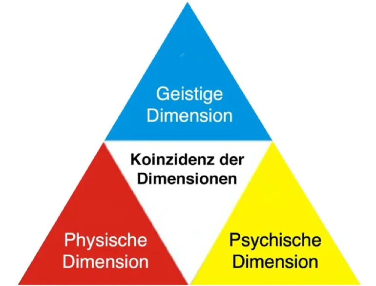Die wissenschaftliche Sicht auf die Phänomene der Welt kennt und anerkennt nur eine, nämlich die ph-ysische Dimension. In meinem Modell der drei metaphysischen Dimensionen bilden die psychische und die geistige Dimension, zusammen mit der physischen, eine instantane Gestalt. Das bedeutet, die physische, psychische und geistige Dimension sind eine primordiale Einheit und Ganzheit, deren Prinzipien von vorn-herein gegeben sind, ohne kausal und chronologisch bedingt zu sein. Das würde in Analogie zu den drei Pri-märfarben und den Eckpunkten des Dreiecks bedeuten, dass man nur eine der drei Farben, unter anderem Gelb, als primordial und real vorhanden anerkennt und die Farben Rot und Blau davon abzuleiten wären. Damit wäre die Gestalt des Dreiecks aufgelöst und nicht mehr vorhanden. Wie es ein Dreieck nur aufgrund von drei Eckpunkten gibt, die seine Gestalt ermöglichen, gibt es ebenso die Ganzheit des Seienden nur auf-grund von drei Dimensionen, die sich in Phänomenen verwirklichen. Wenn man diese Metapher des Dreiecks auf das Modell der drei Dimensionen anwendet, ergeben sich beliebig viele interaktive Möglichkeiten in der Dynamik ihrer Beziehungen.