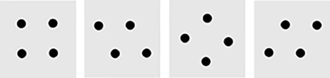 In jedem dieser vier visuellen Elemente A, B, C und D sind vier Punkte zu sehen. Die Quantität der Punkte ist also in jedem Bild dieselbe. Das heißt, dass sich der quantitative Aspekt in diesen vier Bildern nicht voneinan-der unterscheidet; die Quantität der Elemente ist in A dieselbe wie in B, C und D. Die Quantität 4 ist eine ab-strahierte Generalisierung, die auf alle quantifizierbaren Erscheinungsformen zutrifft. Zwischen vier Buch-staben, vier Farben oder vier Signaturen gibt es keinen quantitativen Unterschied. Die Unterschiede sind qualitativ und ergeben sich aus dem wahrnehmenden Empfinden von Relation und Beziehung (Bild 13, 14 und 15).