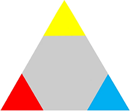 Keine dieser drei Farben sind das Resultat einer kausalen Entwicklung aufgrund einer vorhergegangenen Farbe. Das heißt, weder Gelb noch Rot und Blau können von einer einzigen ursächlichen Farbe hergeleitet und darauf reduziert werden. Daraus folgt, entweder es gibt diese drei Farben unmittelbar und zugleich oder es gibt sie nicht. Entweder gibt es die drei Eckpunkte unmittelbar und zugleich oder es gibt das Dreieck nicht. Die Gestalt des Dreiecks ist entweder und unabhängig von einer kausalen Entwicklung der Fall oder es gibt sie nicht, weil sie nicht der Fall ist. Hier gibt es weder eine Chronologie noch eine Kausalität. Das ist der in-stantane Aspekt der Gestalt, der von vornherein als Einheit und Ganzheit anwesend ist und sich ohne konti-nuierliche Zwischenschritte auflöst, sobald einer der Eckpunkte verschwindet. Analog sind auch die drei Di-mensionen wie die Eckpunkte eines Dreiecks koinzident aufeinander bezogen und sich gegenseitig bedin-gend (Bild 2).