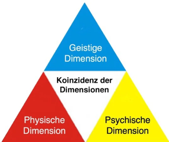 Die wissenschaftliche Sicht auf die Phänomene der Welt kennt und anerkennt nur eine, nämlich die physi-sche Dimension und die beiden anderen, die psychische und geistige Dimension, werden auf das Physische reduziert und bestenfalls davon abgeleitet. Das würde in Analogie zu den drei Dimensionen der Primärfar-ben und den Eckpunkten des Dreiecks bedeuten, dass man nur eine der drei Farben, unter anderem Gelb, als primordial und real vorhanden anerkennt und die Farben Rot und Blau davon abzuleiten wären. Damit wäre die Gestalt des Dreiecks aufgelöst und nicht mehr vorhanden. Wie es ein Dreieck nur aufgrund von drei Eck-punkten gibt, die seine Gestalt ermöglichen, gibt es ebenso die Ganzheit des Seienden nur aufgrund von drei Dimensionen, die sich in Phänomenen verwirklichen. Wenn man diese Metapher des Dreiecks auf das Modell der drei Dimensionen anwendet, ergeben sich beliebig viele interaktive Möglichkeiten in der Dynamik ihrer Beziehungen.