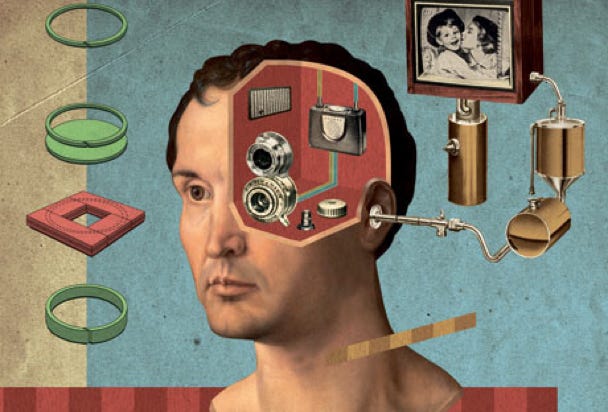 Es ist leicht einzusehen, dass ein intrazerebrales Ich ein subjektives Erleben ermöglicht und die Tatsache sub-jektiv erleben zu können intersubjektiv ist, weil das auf alle Menschen zutrifft. Keinesfalls intersubjektiv sind jedoch die subjektiven Phänomene des Erlebten, des Gedachten und Gefühlten. In jedem Fall ist aber das subjektive Empfinden und Erleben, die Voraussetzung für das Wahrnehmen des Geistigen in gegenstands-losen Bildern und darüber hinaus der gegenstandslosen Welt. Dass den gegenständlichen Phänomenen der Welt gegenstandslose Prozesse zugrunde liegen, lässt sich je, nachdem ähnlich schwer oder leicht verstehen wie der gegenstandslose Aspekt einer objektfreien Collage. Beide erscheinen in Form von Beziehungen. In einer Collage (Bild 5) zeigen sich die Beziehungen darin, wie zwei oder mehrere Bildelemente aufeinander bezogen sind und eine kohärente Bildgestalt bilden. In einem gegenständlich surrealen Bild (Bild 6) kommen die Beziehungen in einer Verortung der Objekte im Raum zum Ausdruck. In der Lebenswelt zeigen sich die Beziehungen etwa darin, wie sich Moleküle sinnvoll aufeinander beziehen und Organismen bilden (Bild 7). Jedes Lebewesen ist in seiner Ganzheit ebenso wie ein Bild, Ausdruck verwirklichter Beziehungen.